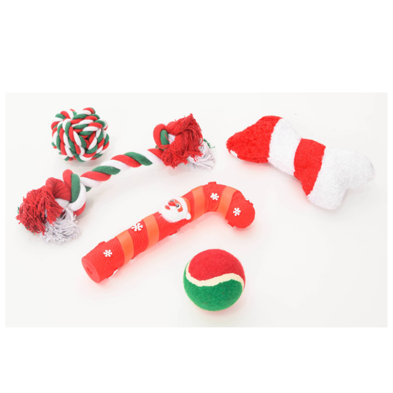 5 olika leksaker med julfärger och motiv.