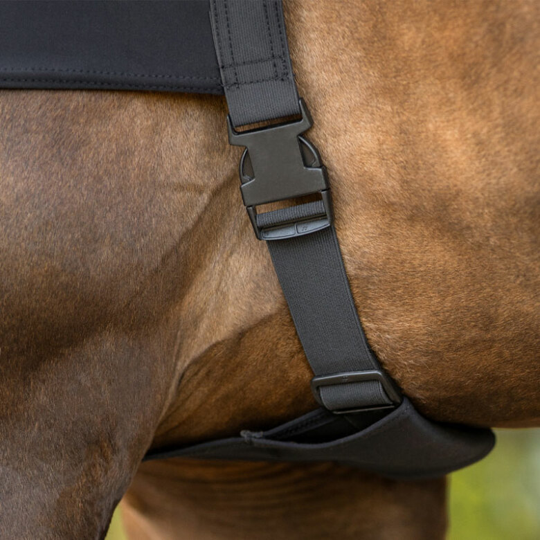 Utrustad med band mellan frambenen som fästes i maggjorden för en stilla passform.