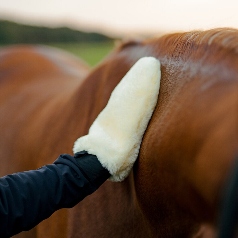 Groominghandske i dubbelsidig mjuk artificiell fårskinn.