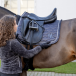 Utrustat med sadelgjordsöglor med 3 fack för olika sadelgjordslägen, samt små kardborrefästen som fästes i sadelns D-ringar för en stilla passform.