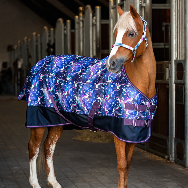 Regntäcke i färgglatt tryck med enhörningar och regnbågar.