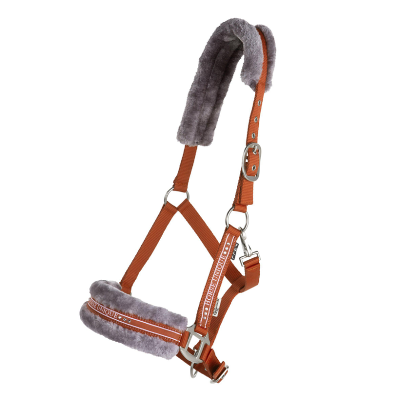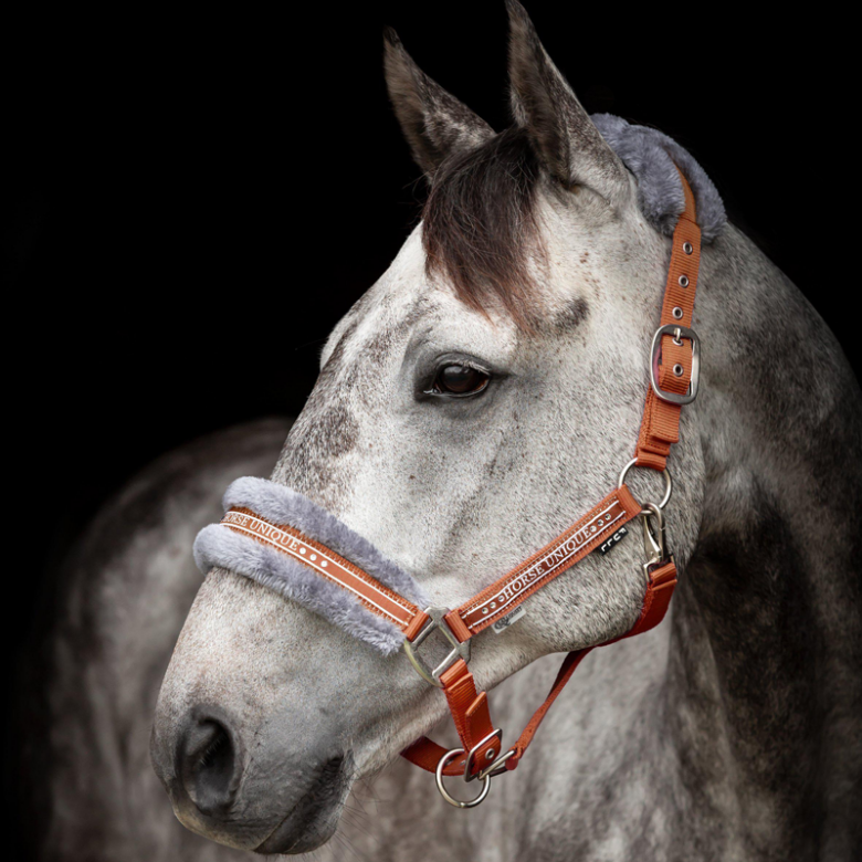 Glitterstenar på sidostycken och nos. Ställbar nack- och nosrem med spännen i matt silver.