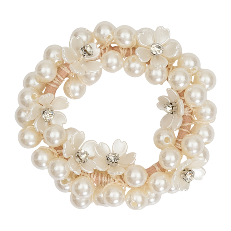 Elastisk hårgummiband med pärlor och blommor i plast.