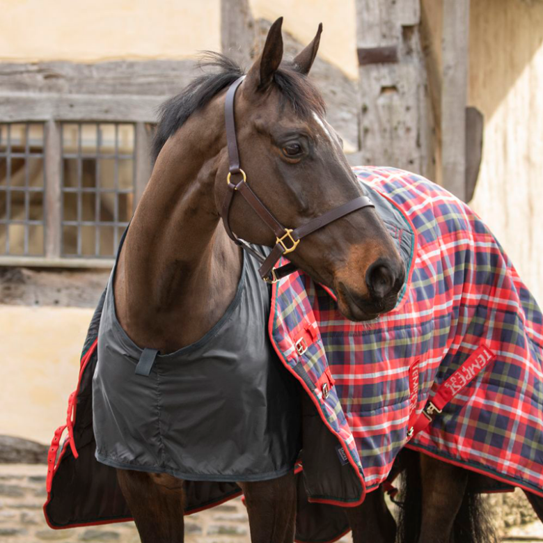 Träs över hästens huvud. Med ögla framtill som kan fästas i täckets frontspänne.